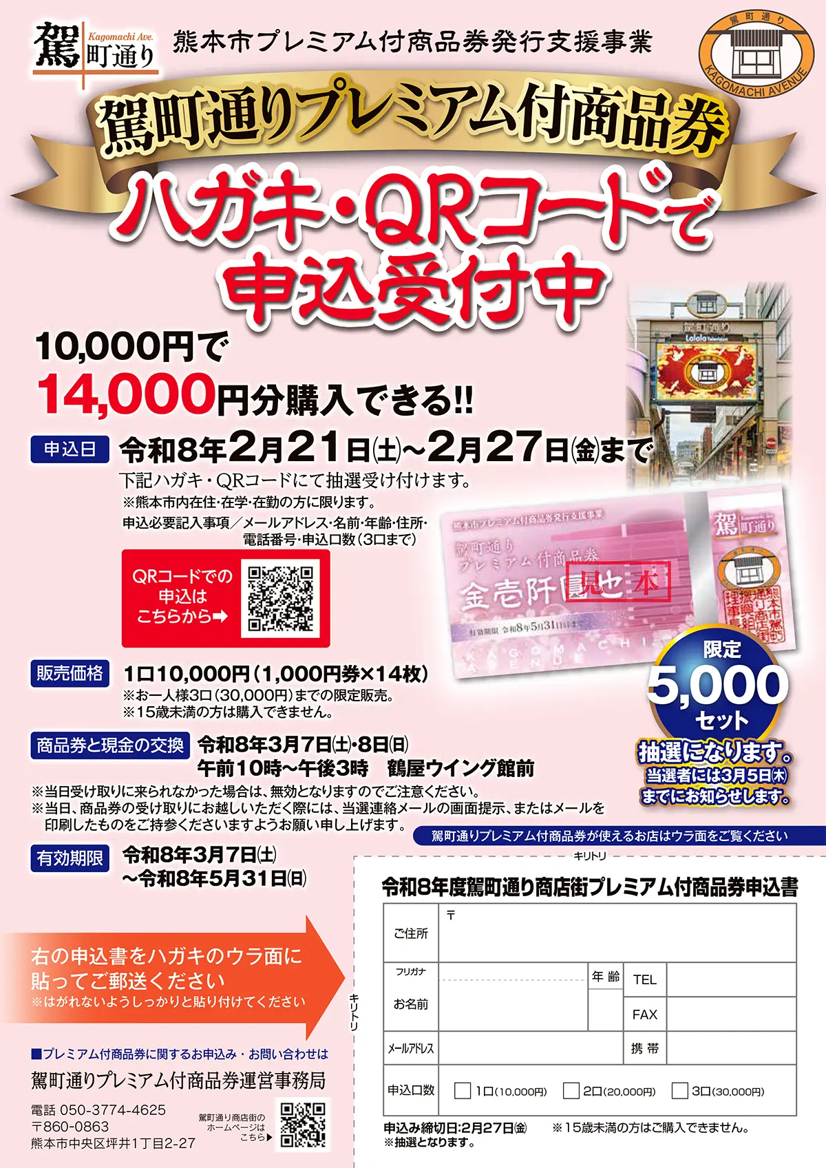 10,000円で14,000円分購入できる!! 駕町通りプレミアム付商品券の抽選申し込みを受け付けています。