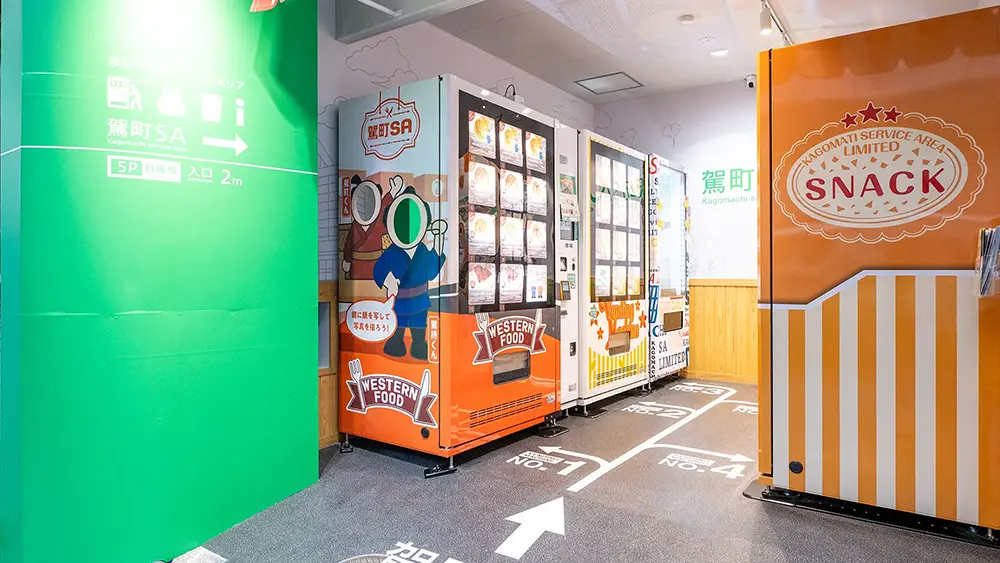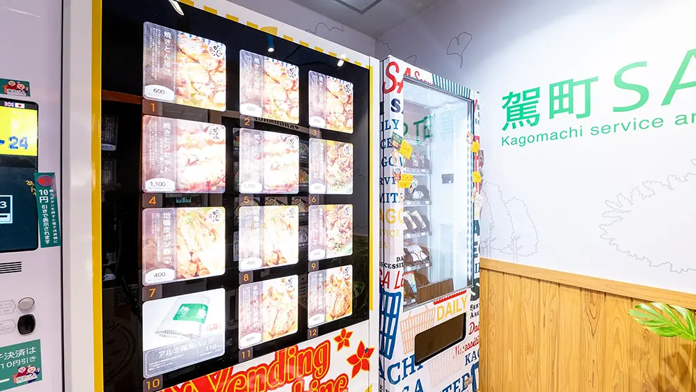 駕町通りをぶらっと歩きながら入れるサービスエリア、 駕町SA 24時間年中無休! 冷凍食品から日用品まで、幅広い商品を自販機で販売中! 公式キャラクターの駕町くん・駕持くんもいっしょに駕町SAを盛り上げます!
